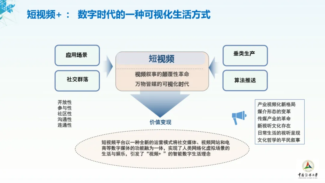 在短视频所构建的应用场景、社交群落中,通过垂类生产、算法推送等方式,塑造了产业视频化的新格局,引领了媒介形态的变革。短视频正在带来一场视频叙事的颠覆性革命,在万物皆媒的可视化时代,短视频平台以一种全新的运营模式将社交媒体、视频网站和电商等数字媒体的功能融为一体,实现了人类网络化虚拟场景的生活与娱乐,引发了「视频+ 」的智能数字生活理念。