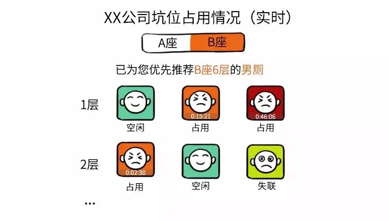 很快,老总就学习某互联网大厂,让程序员们加班三天三夜开发出了一个“找厕所”APP,点击进入,它就会贴心地给你推荐空闲坑位。