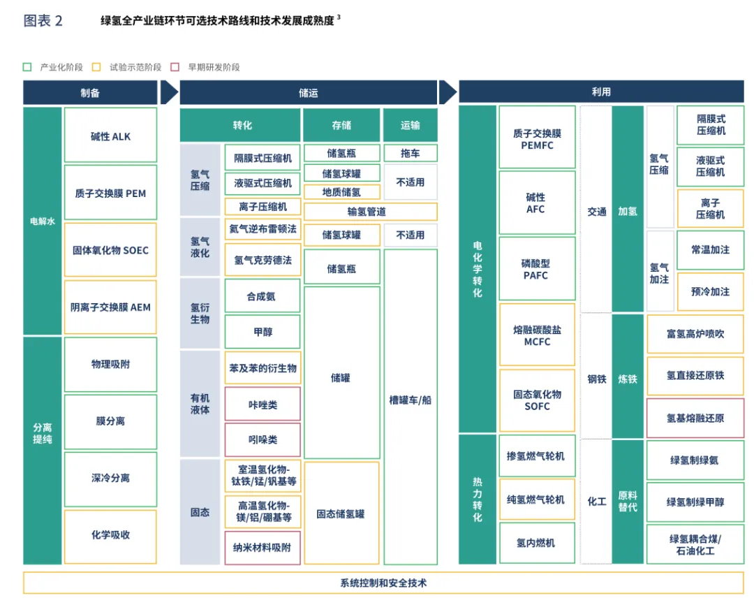 绿氢产业链可以大致分为制备、储运和利用三大环节(如图表 2)。绿氢制备环节是将可再生电力转化为绿氢的过程,核心为制氢电解槽系统,并配套分离、提纯等气体处理技术。然后是氢储运环节,用于调节制氢和用氢环节间的时空错配,这一过程需要将生产出的氢进行压缩、液化或者通过多种化学物理反应转化为易于储运的形态,再将不同形态的氢气用不同容器和介质进行跨周期储存,在储氢的基础上按需利用交通工具或者管道设施将所储氢气进行跨地域输送。最后是绿氢利用环节, 从利用方式看,氢燃料电池是氢作为燃料用途利用的重要技术手段之一;而从用氢场景(如交通、钢铁、化工等)看,因为绿氢的使用在许多传统行业也产生了新技术和新工艺,如交通领域的加氢站技术、钢铁领域的氢还原技术和绿氢化工的新工艺等。