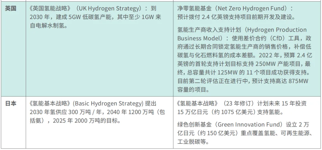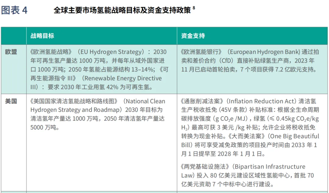 在政策驱动层面,中国的支持力度强劲且持续有力。《氢能产业发展中长期规划(2021–2035 年)》等政策明确了氢能产业的发展目标、重点任务和保障措施,为产业发展提供了政策指引,其中提出到 2025 年,能源制氢量达到 10–20 万吨 / 年;2024 年《中华人民共和国能源法》对氢能在能源管理体系的正式纳入进一步明确其在国家能源体系中的重要地位,为氢能产业的长期稳定发展提供了坚实的法律保障。2025 年 6 月,国家能源局发布《关于组织开展能源领域氢能试点工作的通知》,进一步推动创新氢能管理模式,通过区域协同、试点推广及金融支持等方向,助力氢能全产业链的应用及规模化进程。同时,全球绿氢政策更加趋于明朗,全球不少国家针对氢能提出战略政策目标及资金支持政策,如图表4: