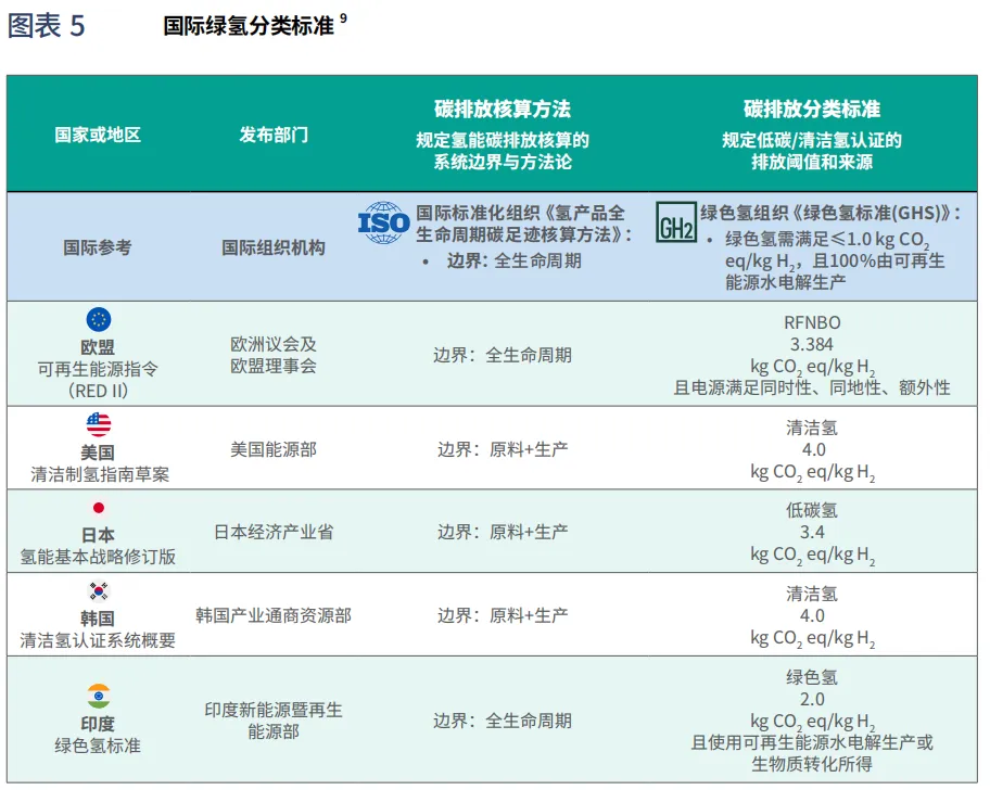 分类标准上,欧盟、美国、日本等国家地区已由最高级别政府出台氢能分类标准,加强绿氢产业监管。而中国目前缺乏全行业统一认可的分类标准,2020 年中国氢能联盟提出的团体标准《低碳氢、清洁氢与可再生能源氢的标准与评价》规定的碳排放阈值仍与国际具有差距,还需进一步加强。