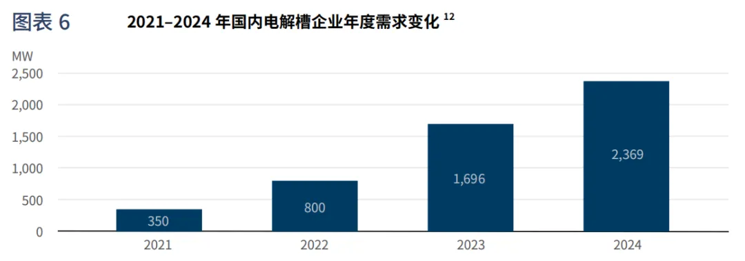 随着各地绿氢装机目标提出和重要企业的积极减碳行动,近年来中国制氢电解槽采购需求快速增长。如图表 6,据氢燃料电池行业研究机构香橙会研究院统计,2024 年中国电解水设备公开招标需求规模超 2369 MW,同比增长约 39.7%,增速虽然相较 2023 年有所回落,但仍处于高速增长期。