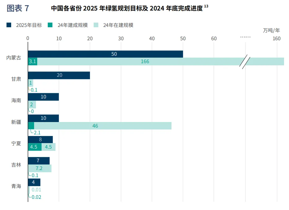 截至 2024 年底,全国绿氢产能装机已达约 15 万吨 / 年,基本可满足《氢能产业发展中长期规划(2021–2035 年)》中提出 2025 年全国可再生能源制氢量目标(10–20 万吨 / 年) ,但各省级 2025 年绿氢发展规划的目标总和却远远超过 20 万吨。如图表 7,多个省份提出了富有雄心的绿氢装机目标,如内蒙古 50 万吨、甘肃 20 万吨、海南 10 万吨等等。根据香橙会统计显示,多个省份已建成绿氢装机虽暂未达标,但开工项目规模仍然可观。