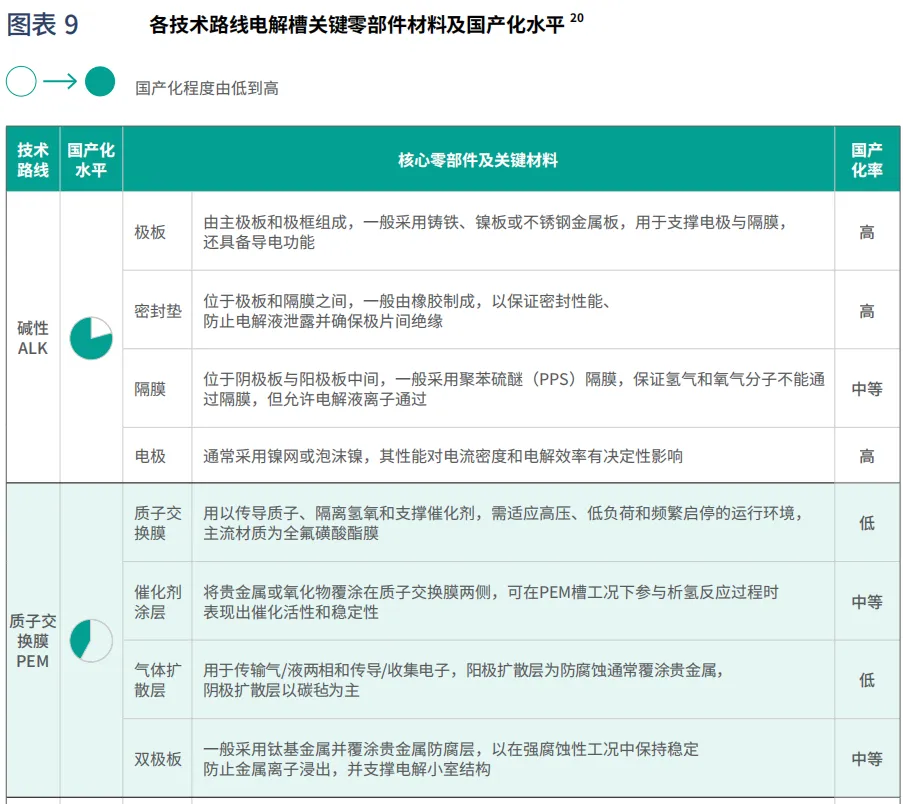总体而言,从技术发展角度我国 ALK 和 AEM 电解槽在全球相对领先,而 PEM 和 SOEC 电解槽仍处于追赶阶段。从全球产能分布来看,截至 2024 年 9 月,国内水电解制氢设备厂商总产能达 32GW,全球占比超过 60% 。其中,中国 ALK 电解槽产能在全球占比约为 70%,而 PEM 电解槽产能方面落后于国外,约占国外产能的 1/10 。推动核心零部件和关键材料国产化可实现成本结构优化,推动电解槽设备进一步降本。在图表 9 中,项目组对各制氢电解槽技术路线中核心零部件和关键材料的国产发展水平进行了评价对比,可以看到普遍在膜和催化剂等关键材料上国产化仍有待突破。
