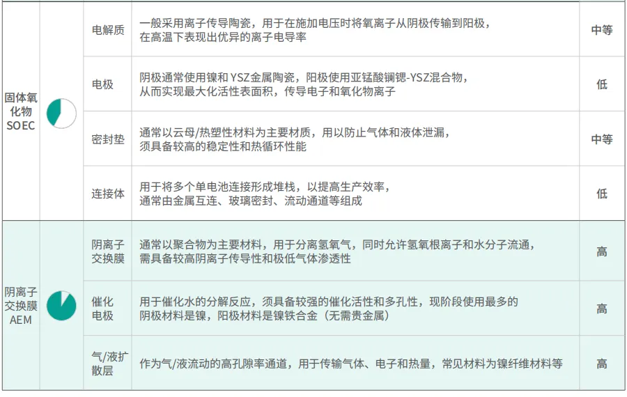 从中短期来看,ALK 电解槽发展成熟度最高,价格领先优势较大,仍将保持作为最主流的电解制氢技术路线。虽然国内 ALK 电解槽厂家在技术指标和成本控制管理方面都处于国际前列,但电解槽性能仍有优化空间,主要的创新机会在于优化制氢效率和应对负荷波动。但随着未来制氢所用离网电力比例不断提高,出于安全和成本的双重考虑,采购方对于电解槽应对负荷波动的能力要求将更为严苛。与此同时,以 PEM 和 AEM 为代表的其他电解制氢技术路线降本提效速度也在加快。因此,从中长期来看,这一市场格局的未来发展仍然存在不确定性。对于PEM 和 AEM 等技术路线而言,技术创新主要将发生在材料选择和设计工艺方面的优化,尤其像以 AEM 电解槽为代表的新技术,结合了 ALK 和 PEM 两种技术的优点。虽然该技术路径当前体量较小,但在绿氢大规模部署的下一阶段,其发展潜力也不容小觑,是值得投资者关注的早期赛道。