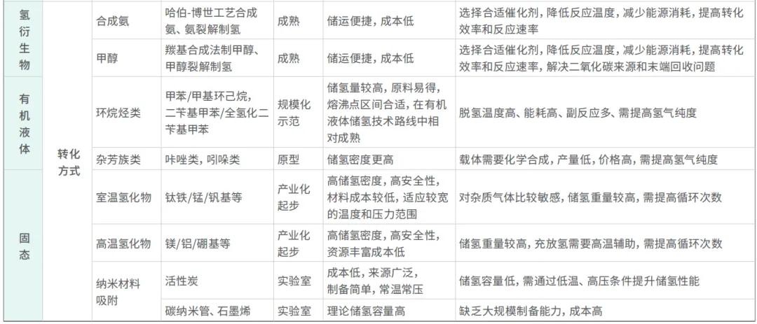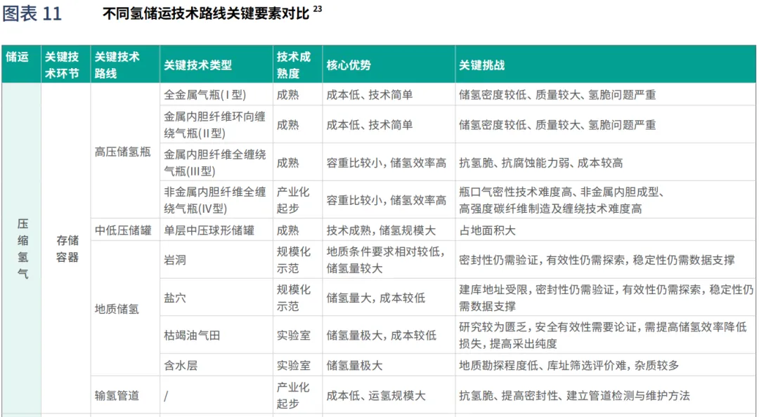 按照产业链的不同环节,氢储运的关键技术可以分为转化方式、储存容器和运输工具三个部分。转化方式板块主要关注如何以最低的能耗和成本, 将氢气转化为更易于储存的形态;储存容器板块聚焦于设计和优化能够安全高效地存储氢气或其转化产物的容器;运输工具板块则关注开发能够高效、便捷地运输氢或储氢容器的运输工具。根据氢气转化过程及转化产物的特点,不同的技术路线在关键技术环节上有所不同,且各环节处于不同的技术成熟度阶段。每种技术路线都有其独特的优势与面临的挑战。图表 11 总结了各技术路线的具体情况。