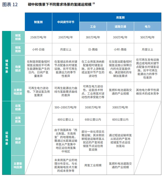 未来随着绿氢供需规模的增加,储运市场规模将具有较大增长。当前已存在的短距离、短时储运场景在未来将进一步扩大规模,此外还将出现大规模、长距离、长时间尺度的氢能储运需求。预计到 2060 年,我国年氢能运输需求将达到 7250–7600 万吨,年储氢需求将达到 4050–4150 万吨 24 ,具体需求场景及各场景储运需求规模如图表12 所示。