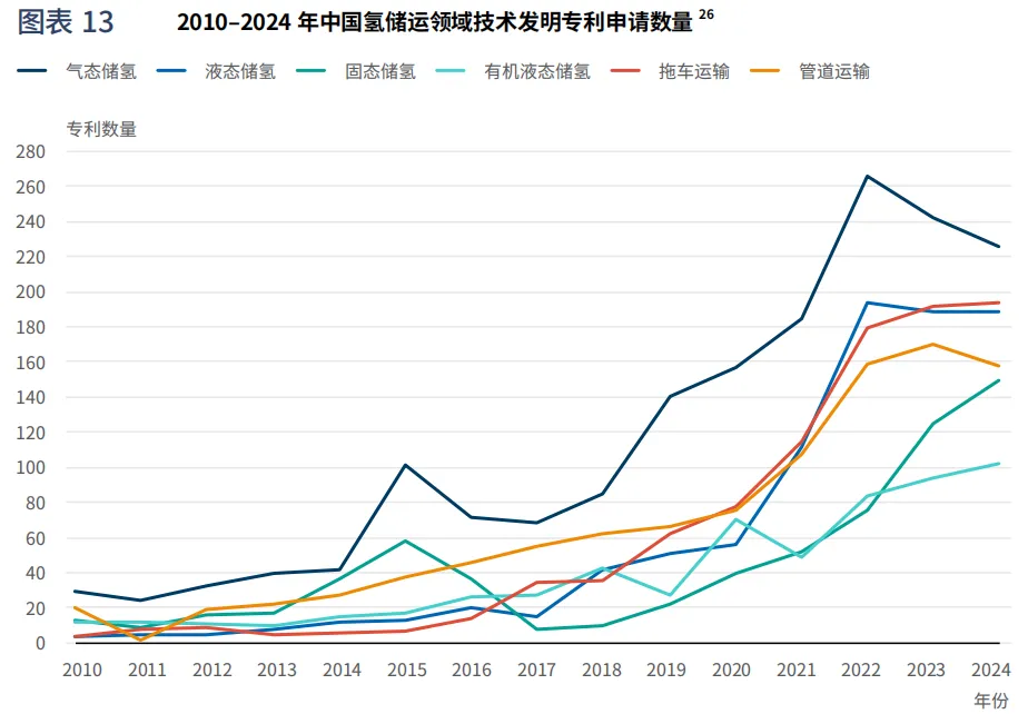 然而,从技术研究的角度看,氢储运技术已经呈现极为多样化的发展趋势。以压缩氢气、液化氢气、氢衍生物、有机液体、固态为储氢介质的五大类技术路线并行发展,除了已经成熟的压缩气氢道路运输之外,其他技术路线都在从实验室阶段向规模化示范阶段迈进。近年来,氢储运领域主要技术的发明专利申请数量都呈现出明显提升趋势(如图表 13 所示) ,反映出氢储运行业内技术创新活跃。在政策支持和资本驱动下,企业、高校和研究机构的研发投入持续增加,储运技术研究进入了快速发展阶段,专利的积累为技术突破奠定了坚实基础。
