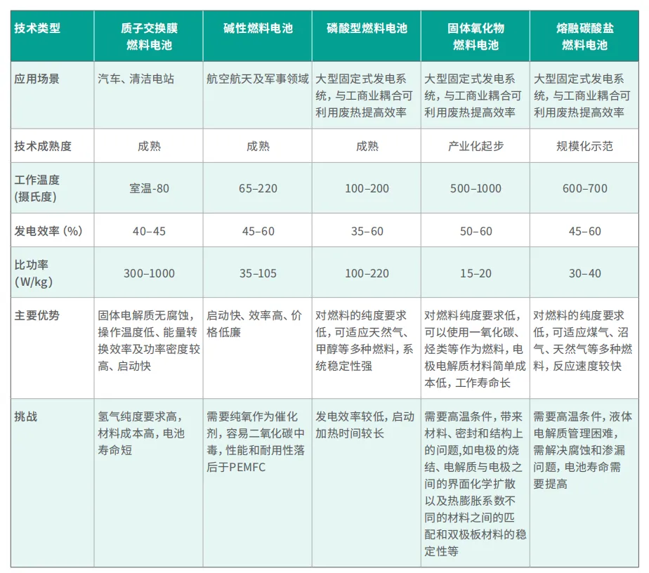 燃料电池是将氢气的化学能直接转换成电能的电化学装置。根据电解质与隔膜类型可划分为质子交换膜燃料电池、碱性燃料电池、磷酸型燃料电池、熔融碳酸盐燃料电池、固体氧化物燃料电池五类较为主流的技术。当前,受到燃料电池汽车示范城市群政策利好,车载PEM 燃料电池成为燃料电池最为主流的应用场景与技术路线,近年来燃料电池装机量持续上涨,2024 年达到 807.42MW。图表 16 总结了氢燃料电池各技术路线的具体情况。