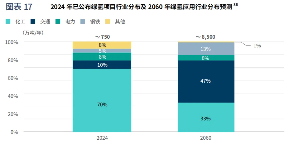 如图表 17,从各场景的用氢规模来看,截至 2024 年底,据势银统计,我国已公布的绿氢项目的用氢场景主要集中在化工行业,其次是交通、电力、钢铁。根据落基山研究所预测,2060 年我国绿氢项目的用氢场景分布按规模从大到小则分别为交通、化工、钢铁、电力。