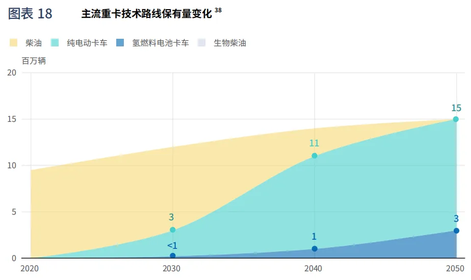 从长远来看,氢燃料电池汽车在长距离、无固定线路以及重型运输场景中展现出不可替代的优势。与电动汽车相比,氢燃料电池汽车的加氢时间短、续航里程长, 并且受电池重量影响较小,能够更好地满足重载运输需求。因此,在长途货运、长途客运、冷链物流以及特种车辆等领域, 氢燃料电池汽车有望发挥重要作用。预计到 2030 年前后,随着氢能全产业链降本进程的推进,氢燃料电池重型车辆的经济性将逐步接近甚至超过传统燃油车,并在市场中占据更大份额。如图表 18,在远期重卡行业可能形成纯电路线和氢燃料电池路线共存的局面。