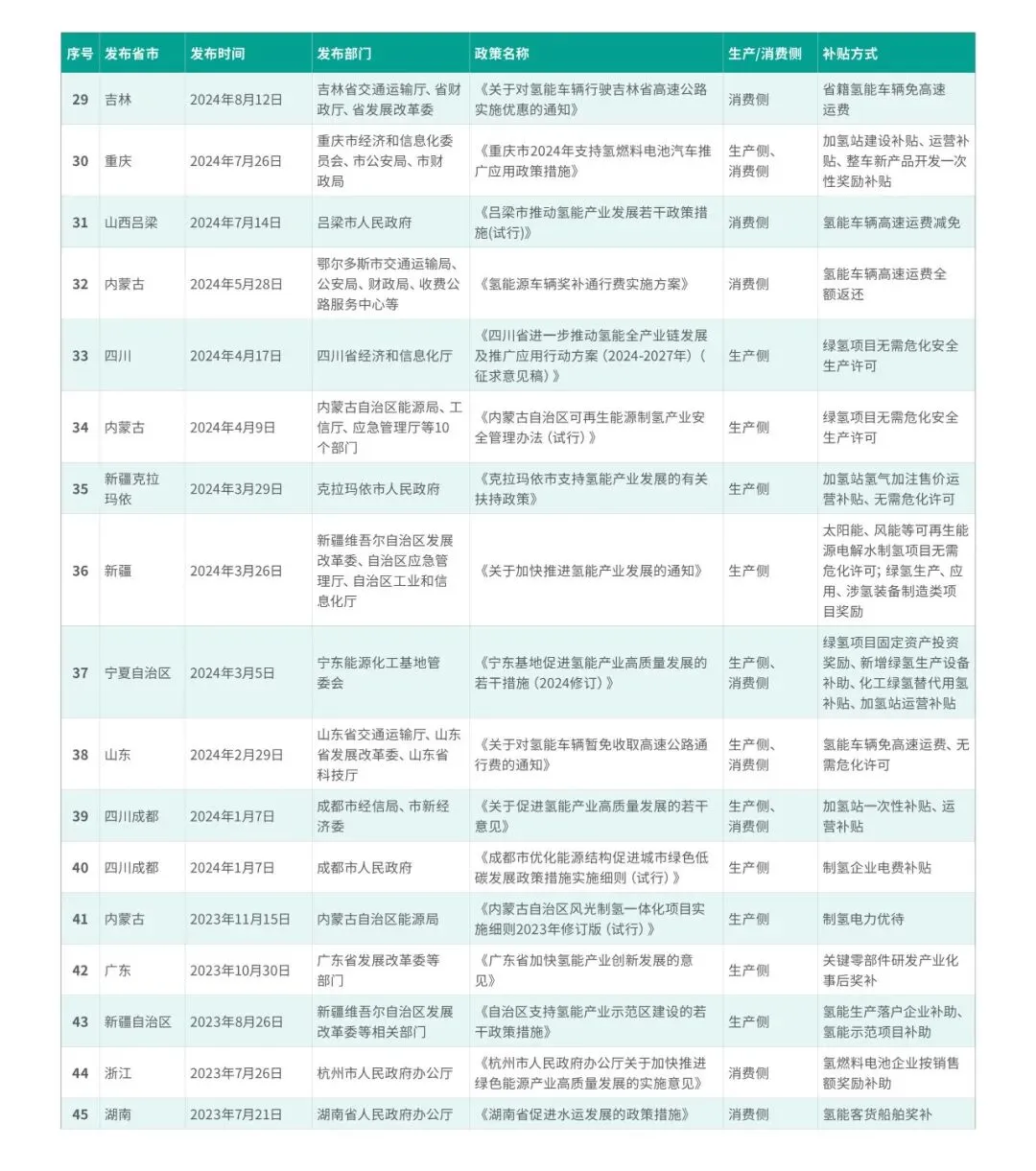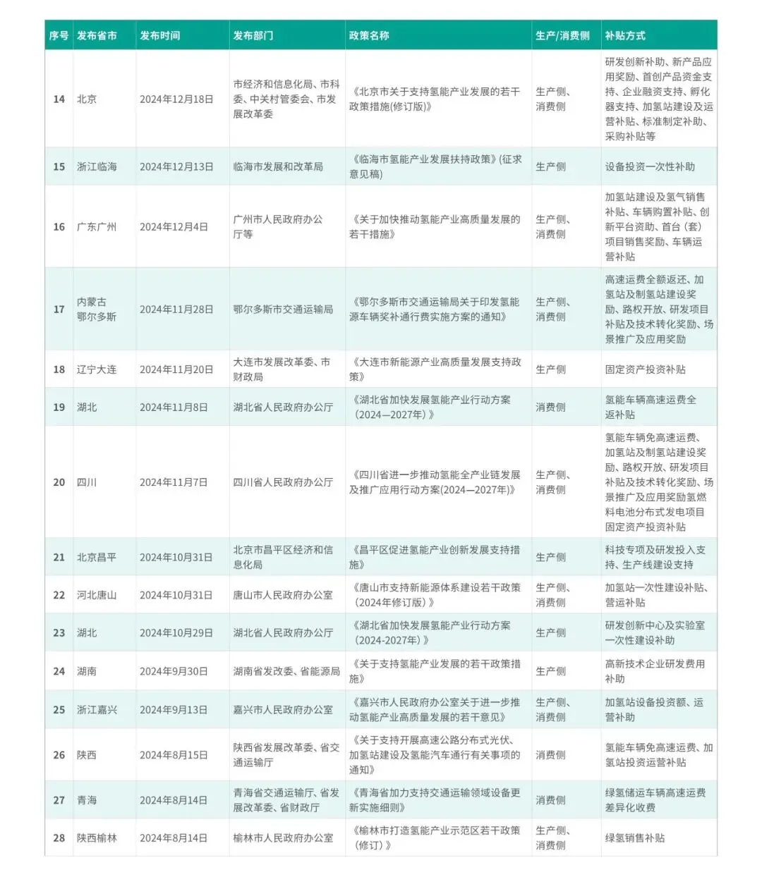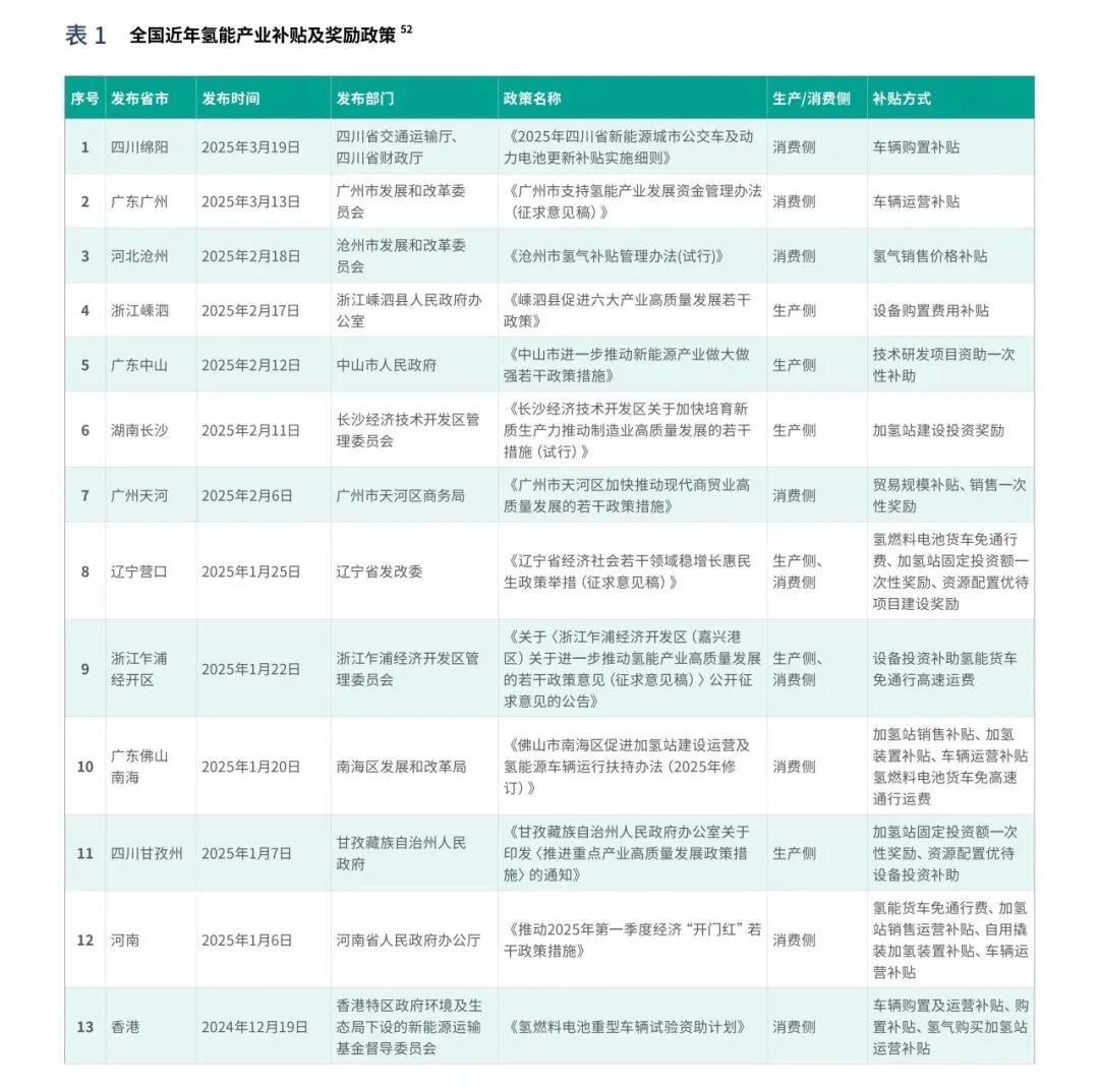 在政策支持层面,早在 2022 年,北京、上海、广东、河南、河北五省市就启动燃料电池汽车示范应用城市群, 省市级地方政府随即出台各类关于燃料电池汽车产业链补贴政策,包括但不限于对于整车购置奖励、关键零部件应用奖励、车辆运营奖励、加氢站建设补贴、氢气零售价补贴等。另外,自 2024 年 3 月起山东成为首个对于行驶高速公路的氢能车辆免收通行费省份后,据不完全统计,截至 2025 年年中全国已有四川、内蒙、陕西、吉林、湖北、辽宁、河南等全省份或部分城市出台氢能源汽车免收高速通行费的相关举措。