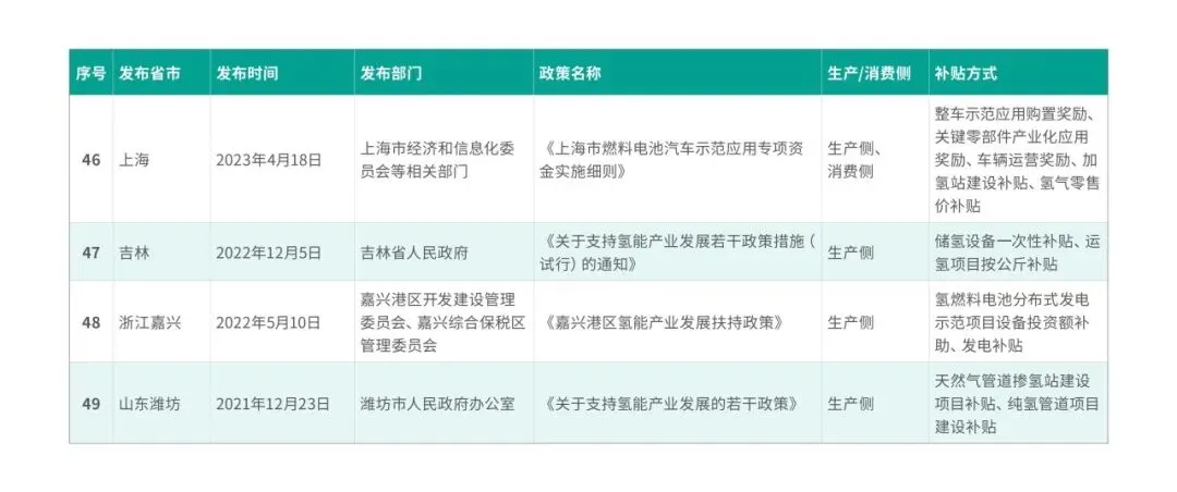 从全国范围内的制氢激励政策出台情况来看,当前仍以地方政策为主且通常要求较模糊。对制氢端的激励形式比较多样化,大致分为以下几类:最直接方式为直接补贴制氢设备采购,对于采购制氢设备给予固定额度或者一定比例的经济补贴,如北京昌平、浙江嘉兴、山东潍坊、宁夏宁东、辽宁沈阳大东等。也有地方按照绿氢产量补贴制氢企业的形式,如吉林省、河南濮阳、内蒙古鄂尔多斯等。此外, 还有针对电解水制氢电费进行补贴的相关政策,如四川成都等。各地发布的政策文件一般会规定所补贴的制氢项目类型,需要为 “绿氢”或者“风光制氢”,其衡量标准比较模糊,并未明确实际制氢中使用可再生电力的比重,或氢气生产全生命周期的碳排放水平等具体指标。
