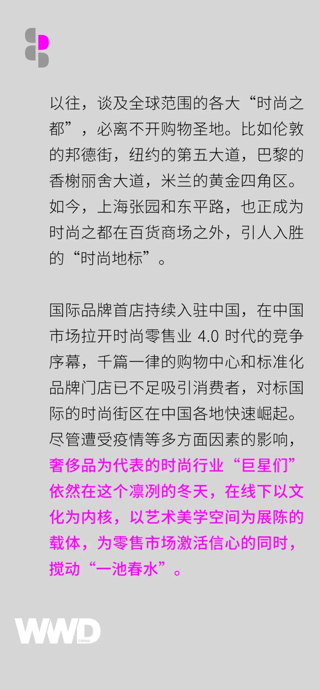 春江水暖鸭先知。时尚品牌对于线下的布局,佐证着一个事实——拐点已经到来。以拥抱在地文化和展陈美学空间的方式,奢侈品为代表的时尚品牌在这个岁末高频出现于线下,这对于 2023 年中国时尚零售市场,是积极信号。WWD