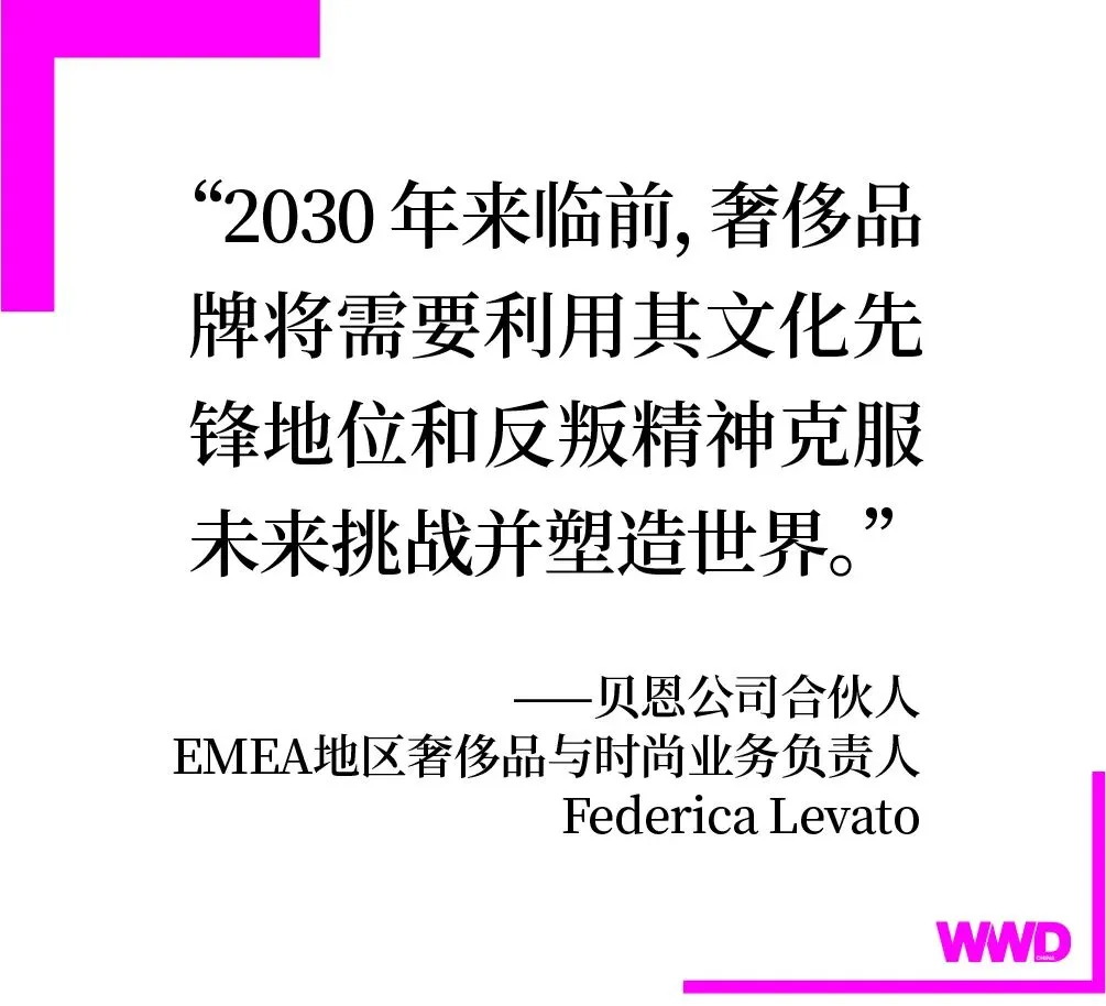 11 月 15 日,贝恩咨询与意大利奢侈品协会 Fondazione Altagamma 联合发布了 2022 年秋季第 21 版《全球奢侈品市场研究》。仅 2022 年度,顶尖奢侈品市场占市场总价值的 40%左右,高于去年的 35%。而奢侈品的数字化转型和线下门店所构成的零售渠道同样重要,据报告分析,未来单品牌专卖店与电子商务之间的界限将进一步模糊,这将进一步推动品牌“全渠道 3.0”的策略。贝恩公司合伙人、EMEA 地区奢侈品与时尚业务负责人 Federica Levato 就奢侈品行业未来十年的关键趋势分析表示:“2030 年来临前,奢侈品牌将需要利用其文化先锋地位和反叛精神克服未来挑战并塑造世界。”