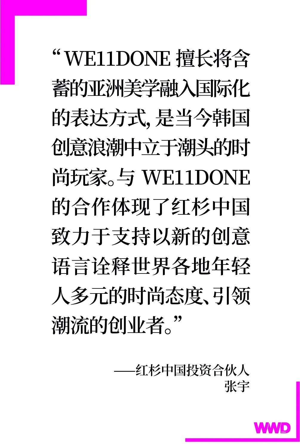 11 月 25 日,WE11DONE 中国西南市场首家官方零售店铺于成都远洋太古里开启。川西风格与现代理念交织融合的店面设计,整体银色视觉兼具多元开放与传统创新的时尚风格。红杉中国投资合伙人张宇曾表示:“ WE11DONE 擅长将含蓄的亚洲美学融入国际化的表达方式,是当今韩国创意浪潮中立于潮头的时尚玩家。与 WE11DONE 的合作体现了红杉中国致力于支持以新的创意语言诠释世界各地年轻人多元的时尚态度、引领潮流的创业者。”
