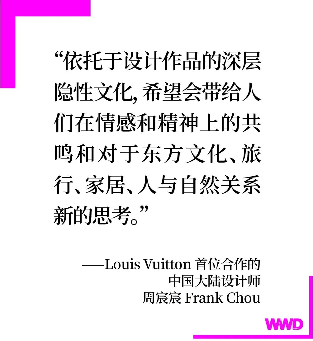 作为 Louis Vuitton 首位合作的中国大陆设计师,周宸宸 Frank Chou 告诉WWD 中文版:“ 如今的家居空间不再是局限在狭义上的温暖安全温馨的一个状态,而是更具冒险精神的一种追求,同时也需要能够彰显他/她个性这样的器物在家里存在。从设计内核出发时,该系列的设计其实是以东方文化的思维模式来思考人与自然的和谐关系,在寻找一个’人造物’却又与其周围的’自然物’和谐的状态。这种依托于设计作品的深层隐性文化,希望会带给人们在情感和精神上的共鸣和对于东方文化、旅行、家居、人与自然关系新的思考。”