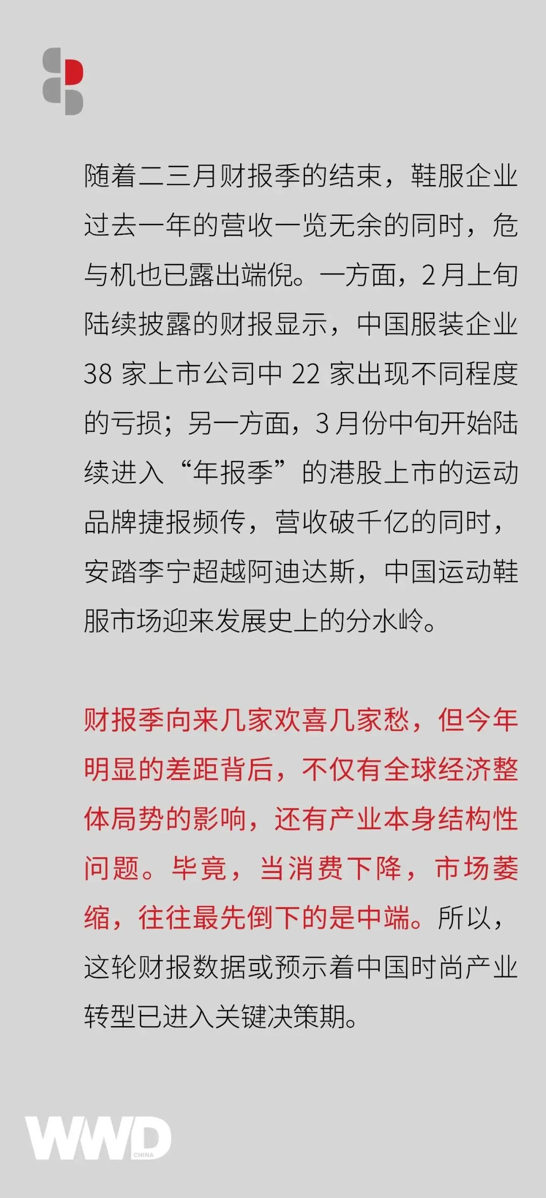 鞋服,是每个人都绕之不开的消费品,凭借人口优势,中国市场需求是显性的产业机会。安踏、李宁超越阿迪达斯当然是积极的信号。但新竞合关系中,持续增长的压力依然存在。随着中外鞋服品牌的竞争加剧,在并不乐观的宏观趋势下,细分市场也存在着新的压力。而此时,高端化/品质化、专业化/功能化,将为致胜增添砝码。WWD