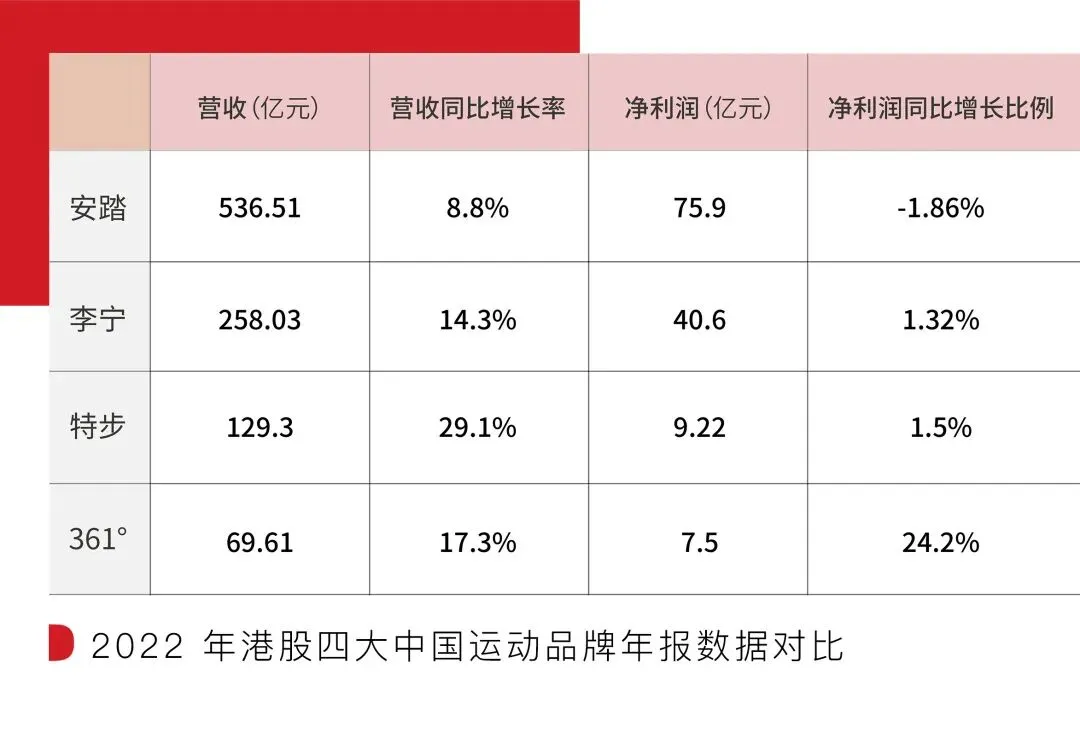 另一方面,运动市场也表现耀眼。但看似光鲜的背后,也已进入营收增长,利润不涨的尴尬处境。3 月中旬,港股上市的四大国潮运动品牌陆续发布年报。其中,361°近些年持续增长,今年同比增长 17.3%,以 69.61 亿元营收再度打破历史记录。“老牌国货”李宁集团全年收入是 361°年营收的近四倍,以 258.03 亿元实现同比增长 14.3%。而近些年扶摇直上成为中国时尚运动品牌行业“老大”的安踏,实现了同比上涨 8.8%的佳绩,全年营收 536.51 亿元,是李宁集团的 2 倍之多。