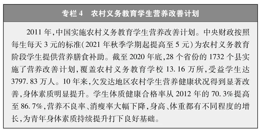 教育机会更加均等。中国教育事业优先发展不断深化,中国青年享有更加平等、更高质量的教育机会。2021年,中国义务教育巩固率达95.4%;高中阶段毛入学率达91.4%;高等教育毛入学率达57.8%、在学总规模达4430万人,居世界第一,越来越多的青年打开了通往成功成才大门的重要路径。覆盖学前教育至研究生教育的学生资助政策体系建成且日趋完善,2020年资助资金总额超过2400亿元、资助学生近1.5亿人次,实现“三个全覆盖”②。义务教育阶段进城务工人员随迁子女、农村和贫困地区学生等群体受教育权益得到充分保障。2020年,85.8%的进城务工人员随迁子女在公办学校就读或享受政府购买学位服务;2012年至2021年,农村和贫困地区重点高校专项招生计划定向招生超过82万人,让更多的青年公平享有接受更好教育的机会,阻断贫困的代际传递。