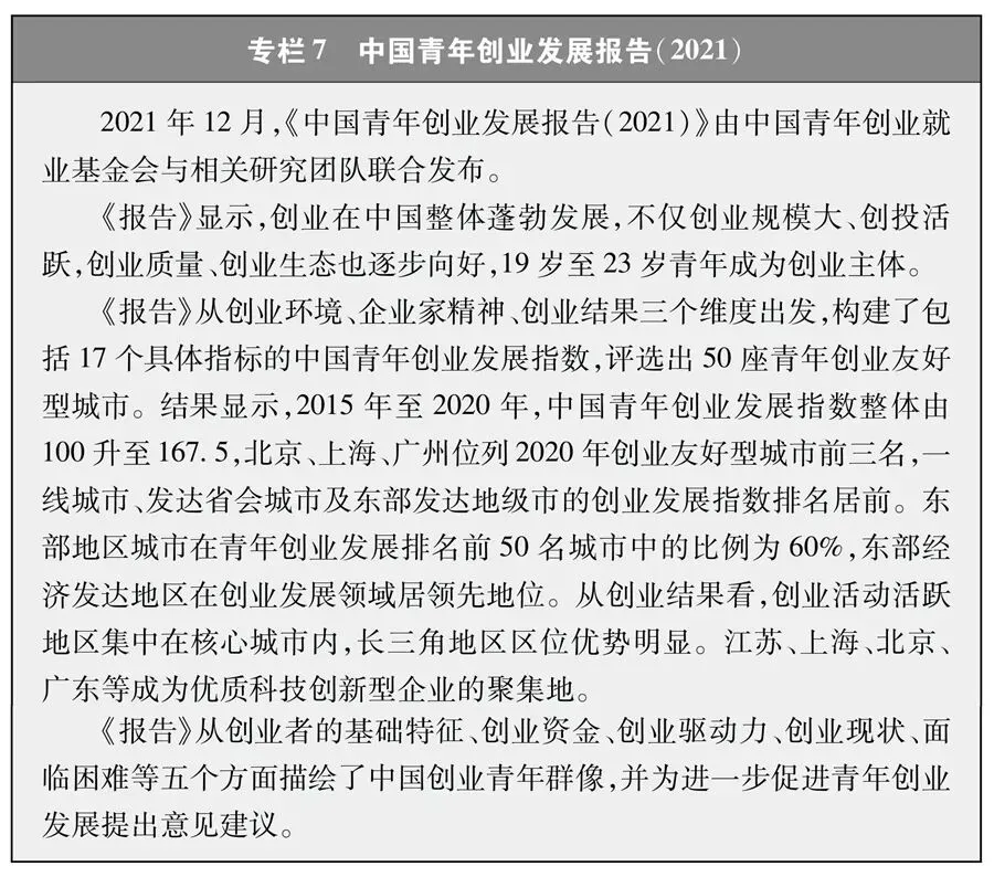 政策保障日益完备。针对中国青年多元化发展需求,国家强化政策服务导向,健全完善政策体系。国民经济和社会发展“十三五”和“十四五”规划鲜明体现青年元素,科教兴国、人才强国、创新驱动发展、乡村振兴、健康中国等国家重大战略充分关注青年群体,青年发展得到越来越多的顶层设计支持。2017年4月,中共中央、国务院制定出台新中国历史上第一个国家级青年领域专项规划——《中长期青年发展规划(2016-2025年)》,为新时代中国青年发展提供根本政策指引。针对青年在毕业求职、创新创业、社会融入、婚恋交友、老人赡养、子女教育等方面的操心事、烦心事,党和政府高度重视,各项政策举措持续出台,青年发展型城市建设蓬勃开展,青年优先发展理念日益深入人心。目前,从中央到地方的青年工作机制基本建成,具有中国特色的青年发展政策体系初步形成。青年充分享受政策红利,实实在在感受到关爱就在身边、关怀就在眼前。