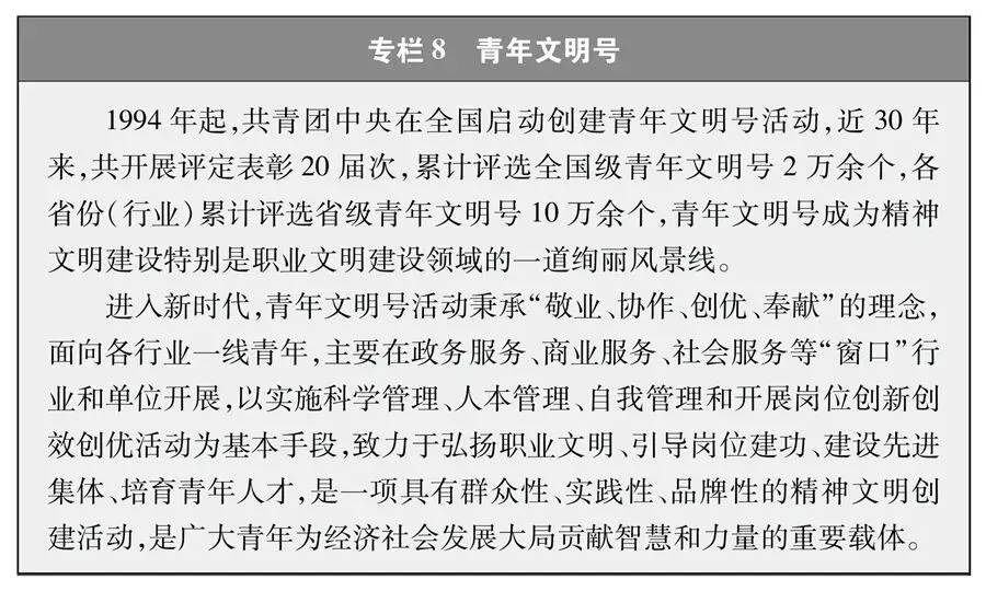 无论在城镇还是乡村、企业还是学校,青年都自觉把正确的道德认知、自觉的道德养成、积极的道德实践紧密结合起来,带头倡导向上向善社会风气、塑造社会文明新风尚。在城乡社区建设中,越来越多的青年投身社区治理和服务体系建设,主动参加“社区青春行动”,加强实践锻炼、提升服务贡献。在各行各业,青年秉承“敬业、协作、创优、奉献”的理念,踊跃创建“青年文明号”,大力弘扬新时代职业文明,展现新时代职业形象。广大青年运动员弘扬体育道德风尚,以良好的赛风赛纪和文明礼仪,获得竞技成绩和精神文明双丰收。1993年“中国青年志愿者行动”启动以来,志愿服务成为青年参与社会治理、履行社会责任的一面旗帜,成为青年在奉献人民、服务社会中锻炼成长的重要途径。截至2021年底,全国志愿服务信息系统中14岁至35岁的注册志愿者已超过9000万人,他们活跃在社区建设、大型赛事、环境保护、扶贫开发、卫生健康、应急救援、文化传承等各个领域,弘扬“奉献、友爱、互助、进步”的志愿精神,在全社会形成团结互助、平等友爱、共同前进的新风尚。中国青年志愿者扶贫接力计划研究生支教团、大学生志愿服务“西部计划”连续18年派遣41万余名研究生、大学毕业生,到中西部2100多个县(市区旗)开展扶贫支教、卫生医疗等志愿服务。青年始终是大型赛会志愿服务的主体力量,给千家万户乃至全世界留下深刻印象。