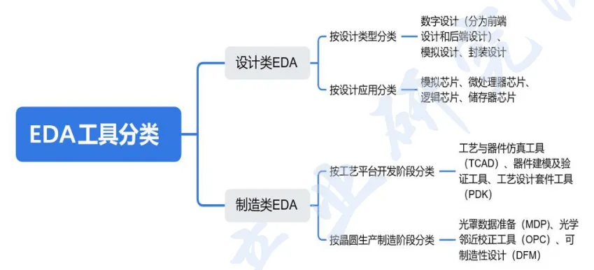 集成电路设计与制造流程均需要对应的 EDA 工具。因此,EDA工具可分为设计类 EDA 与制造类 EDA 两大类别。设计类 EDA 按设计类型,可分为数字设计(细分为前端设计和后端设计)、模拟设计、封装设计;按设计应用分类,可分为模拟芯片、微处理器芯片、逻辑芯片、储存器芯片等应用场景。制造类 EDA 方面,按工艺平台开发阶段,可分为工艺与器件仿真工具(TCAD)、器件建模及验证工具、工艺设计套件工具(PDK);按晶圆生产制造阶段,可分为光罩数据准备(MDP)、光学邻近校正工具(OPC)、可制造性设计(DFM)。