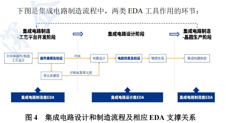 下图是集成电路制造流程中,两类 EDA 工具作用的环节: