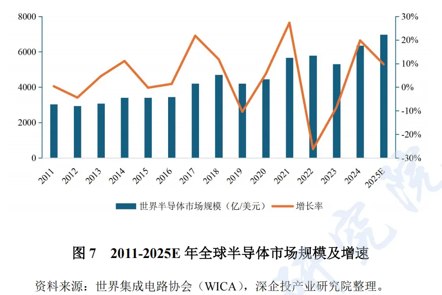 从下游市场看,在人工智能等应用带动下,全球半导体市场进入新一轮增长周期。当前,大模型参数数量大、训练数据量大、模型复杂度高等特征对计算资源需求不断加强,高性能计算能力、大量存储空间、快速信息传输成为大模型训练和运行的计算核心要素,加大了对高性能半导体产品需求。存储器价格受市场需求刺激影响下从低位逐渐回升,销量开始释放,实现量价齐升。2024 年全球半导体市场规模达到 6351 亿美元,同比增长 19.8%。受美国新的关税政策影响,预计 2025 年全球半导体市场规模将提升到 6967 亿美元,同比增长9.7%。