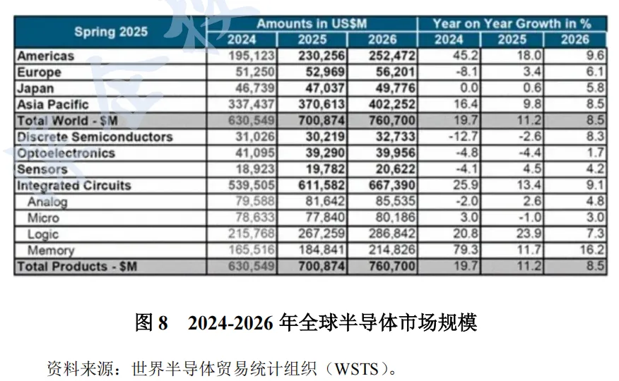 根据世界半导体贸易统计组织(WSTS)预测,2026 年全球半导体市场将进一步增长 8.5%,规模达 7607 亿美元,内存将再度引领增长,而在欧洲和日本明显走强的影响下四大地区(美洲、亚太、日本、欧洲)均将实现规模提升。