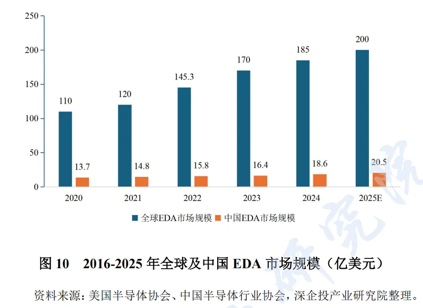 全球 EDA 工具市场规模持续增长。根据美国半导体协会和中国半导体行业协会数据,全球 EDA 工具市场规模从 2020 年 110 亿美元,逐步增至 2024 年的 185 亿美元,预计 2025 年达到 200 亿美元;中国市场规模从 2020 年的 13.7 亿美元,逐步增加值至 2024 年的 18.6亿美元,预计 2025 年达 20.5 亿美元。