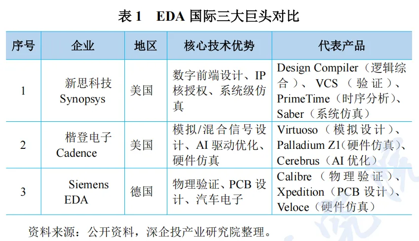 全球 EDA 行业由三巨头主导,市场集中度高。新思科技 Synopsys、楷登电子 Cadence 以及西门子 EDA(前身为 Mentor Graphics)组成行业第一梯队,在全球 EDA 市场中形成垄断态势。
