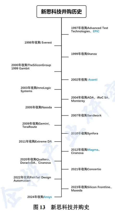 在芯片设计领域,1997 年,新思科技收购了深亚微米分析的 Epic Design Technology 和开发高级仿真产品的 Viewlogic Systems;2002年以 8.3 亿美元收购 Avant!公司。收购 Avant!后,公司发挥 Avant!Astro工具的优势,先是和 Physical Compile 结合在一起,又和 Physical Compile 完全整合为强大的 IC Compiler,能够并行执行物理综合、时钟树综合、布局、布线、良品率优化和校正等功能,直接衔接新思科技的前端和后端工具,由此成为 EDA 历史上第一家可以提供顶级前后端完整 IC 设计方案的领先 EDA 工具供应商。2020-2023 年又陆续收购了 Concertio 、FishTail Design 、Automation 、Silicon Frontline 和Maxeda 等公司。2024 年新思科技宣布,将以每股197 美元现金和0.345股新思科技普通股的对价,收购仿真分析软件公司Ansys ,此次交易是研发设计类工业软件的横向整合,Ansys 则是 CAE 软件的龙头。通过并购,新思科技市场份额在 2008 年超越楷登电子,此后持续稳居全球 EDA 市场领先地位。