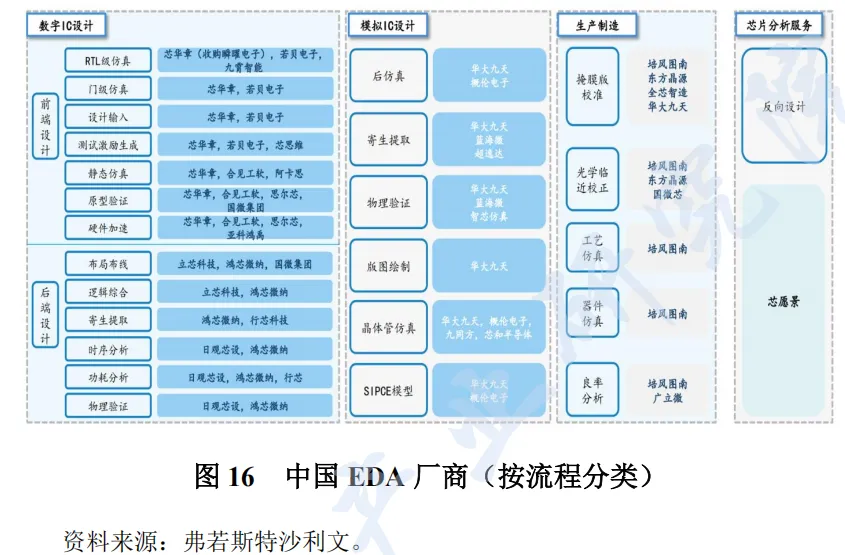 在中国EDA 行业生态中,各细分品类全面发展具备优势。国内主流厂商包括华大九天(A 股)、广立微(A 股)概伦电子(A 股)、国微集团、芯华章、培风图南、思尔芯等。在前端设计领域,芯华章进行了全面布局,在后端设计方面,鸿芯微纳表现突出,模拟 IC 设计领域则由华大九天引领,生产制造环节,培风图南全面实现了TCAD 及 OPC 等工具开发,其他企业正在积极推动技术创新和市场拓展。