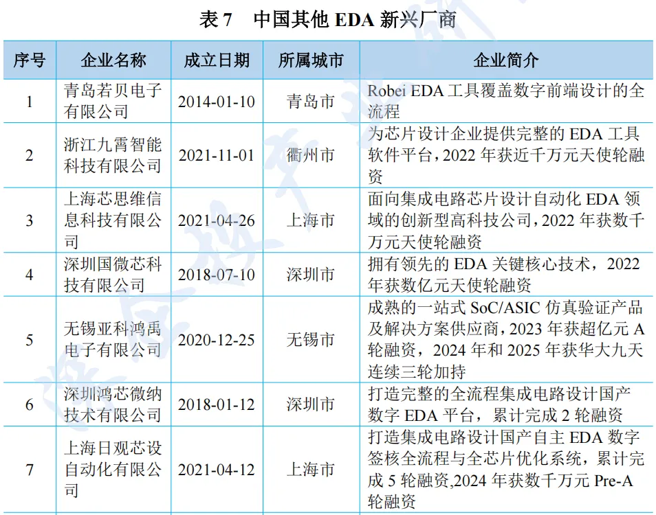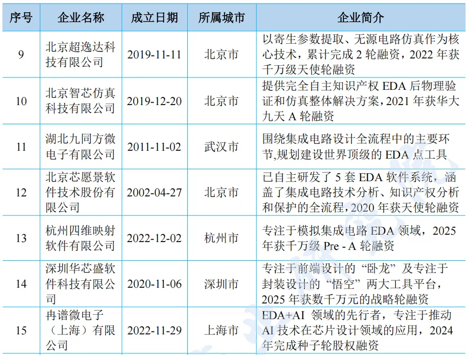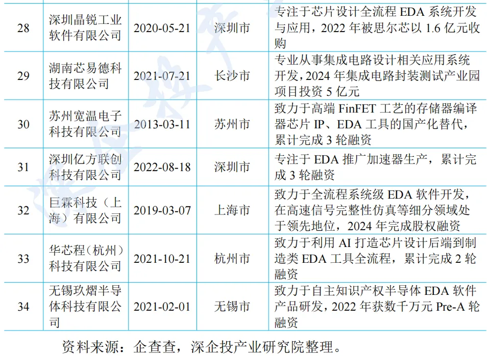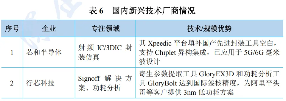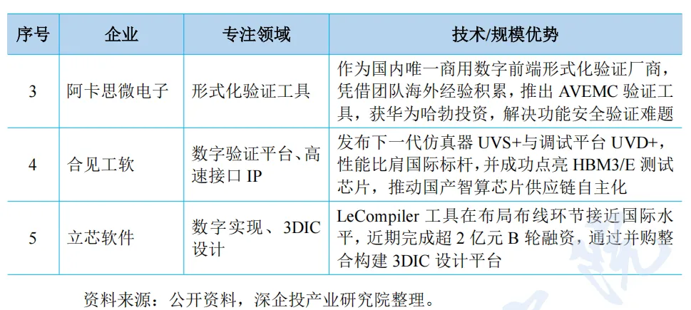 国内新兴 EDA 技术厂商近年来在细分领域快速崛起。近年来兴起的国产厂商包括芯和半导体(已被华大九天收购)、行芯科技、阿卡思微电子、合见工软等,如下表所示。这些厂商通过差异化创新与生态协同,正逐步打破国际垄断,在成熟工艺替代与先进封装等赛道形成突破。
