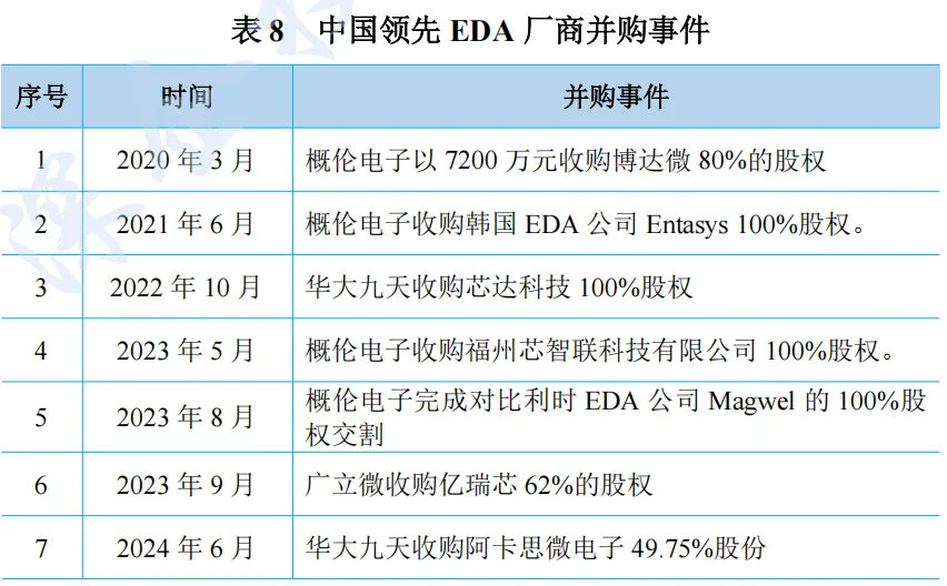 近年国内EDA 行业并购事件频繁,企业兼并重组进程加快。2023年 8 月份概伦电子完成了对比利时 EDA 公司 Magwel 的 100%股权交割。2023 年 5 月概伦电子收购了福州芯智联科技有限公司 100%股权。 2022 年 10 月,华大九天收购芯达科技 100%股权。2024 年 6 月华大九天收购阿卡思微电子 49.75%股份。2025 开年来,华大九天公告拟收购芯和半导体、概伦电子公告拟收购锐成芯微。