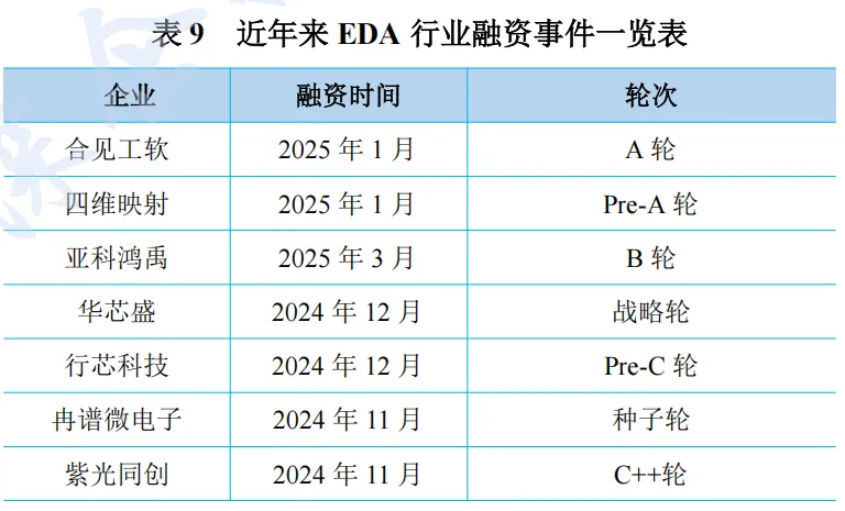 国内 EDA(电子设计自动化)产业发展热度攀升,资本对该领域的关注与投入持续加码。合见工软在 2025 年 1 月完成近 10 亿元 A轮融资,获浦东创投集团旗下浦东引领区基金支持;四维映射同期拿到斯科基金千万级人民币 Pre-A 轮融资。亚科鸿禹融资活跃,2024年 3 月有允泰资本、华大九天(战略跟投)参与第二轮融资,2025年 3 月又完成 B 轮融资,投资方包括九天盛世 EDA 基金、大湾区基金。华芯盛、行芯科技等也在不同时间节点,凭借各自技术与发展潜力,吸引广立微领投、国家大基金二期等投资方注入资金,这些融资为 EDA 厂商技术研发、业务拓展提供助力,也折射出产业生态构建过程中资本的关键作用,反映出市场对 EDA 技术创新及国产替代的期待与布局。