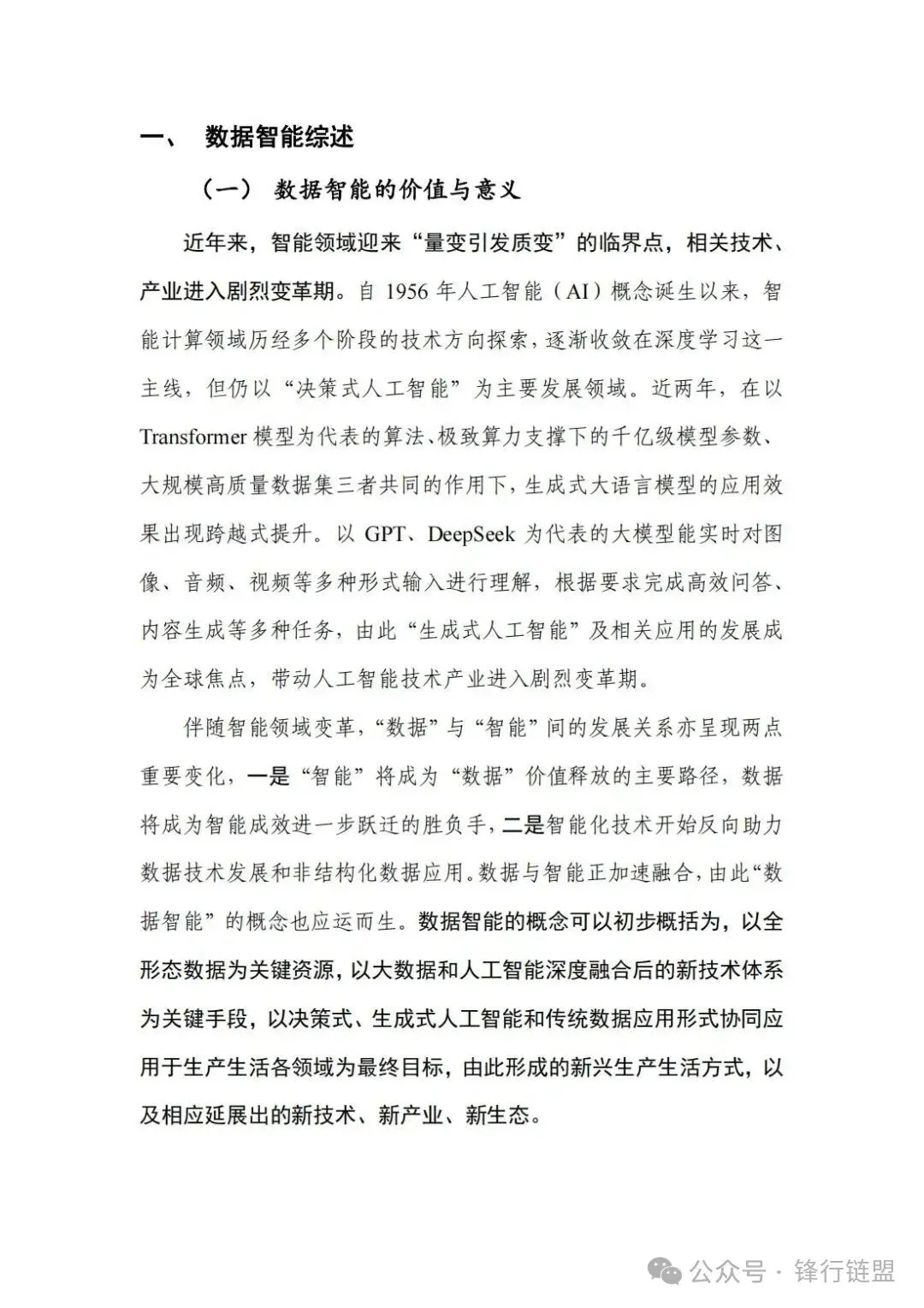 本报告诞生于一个关键的时间节点:生成式人工智能(以GPT、DeepSeek等大模型为代表)取得突破性进展,并开始与大数据产业深度融合,催生出“数据智能”这一新兴领域。报告敏锐地捕捉到这一产业融合趋势,其核心价值在于: