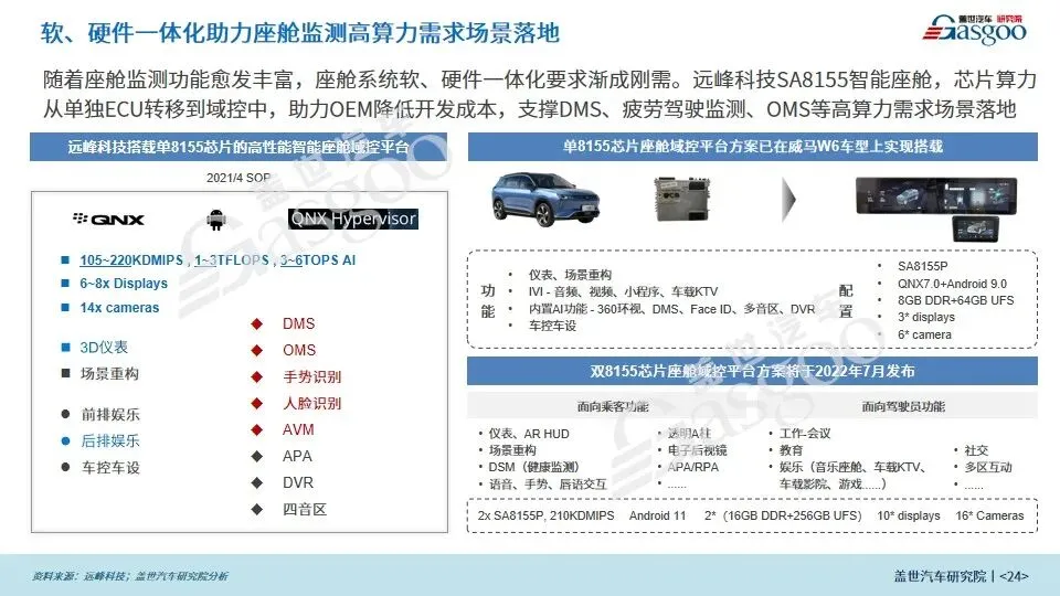 • 为了满足更高的小型化、集成化需求,DMS解决方案将进一步与舱内其他功能进行融合或硬件集成,将发展成一体式的座舱监控系统,将融入更多的感知功能及更广的监测范围,并且可以提供从上车到下车的全场景座舱监控方案。同时,与自动驾驶功能结合,实现车内外安全一体化。