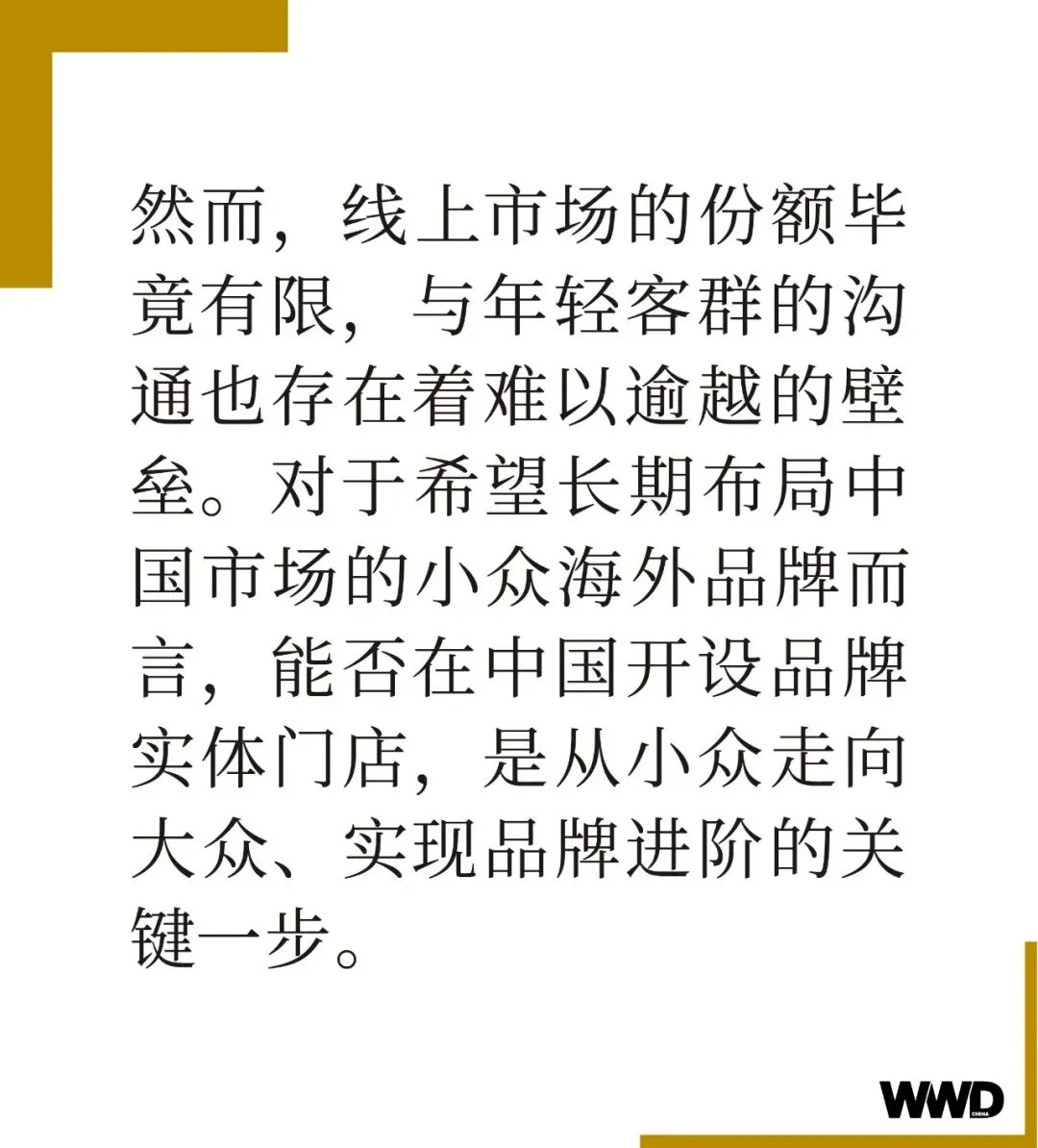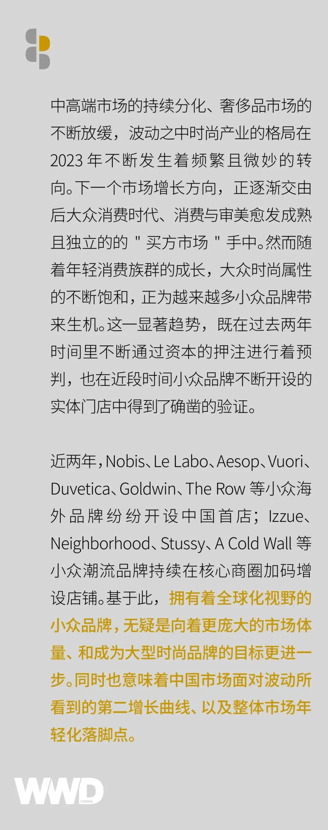 对于小众海外品牌而言,以中国市场为核心,唤醒大众消费者的小众需求,几乎是一条绝对正确的路径。但这只是拓宽市场基盘的第一步,如何持续深化品牌魅力,引发大众共鸣,实现从 10 到 100 的更高增长还需从长计议。WWD