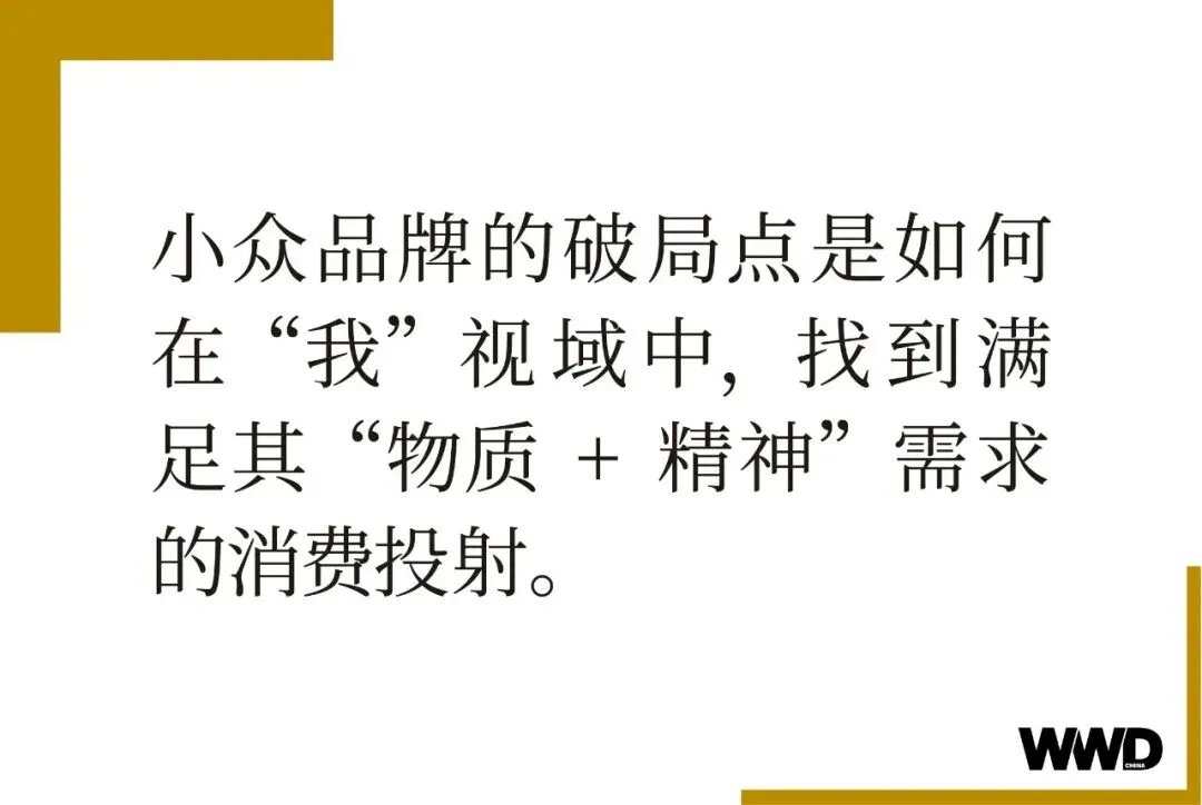 当下,随着消费者画像的逐渐细化,我们也看到任何一个消费者身上所蕴含的无限商业可能性。基于消费者多元爱好、个性化意识和审美性提升,只要品牌与其属性吻合,即可产生稳固、长久的关系,因此,小众品牌的破局点是如何在“我”视域中,找到满足其“物质+精神”需求的消费投射。