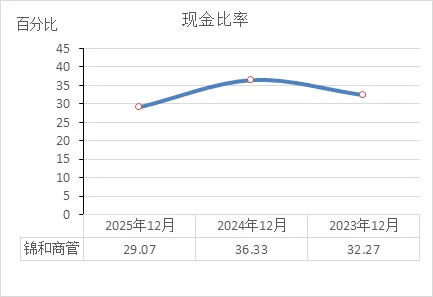 三年的现金比率:2023年32.27%,2024年36.33%,2025年29.07%。