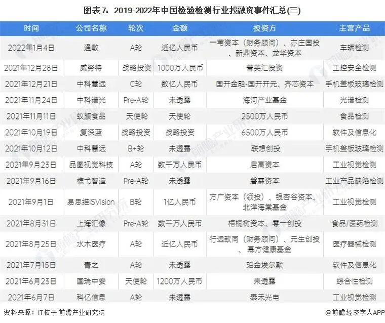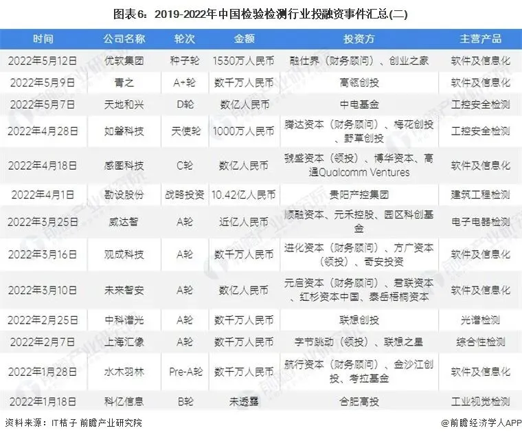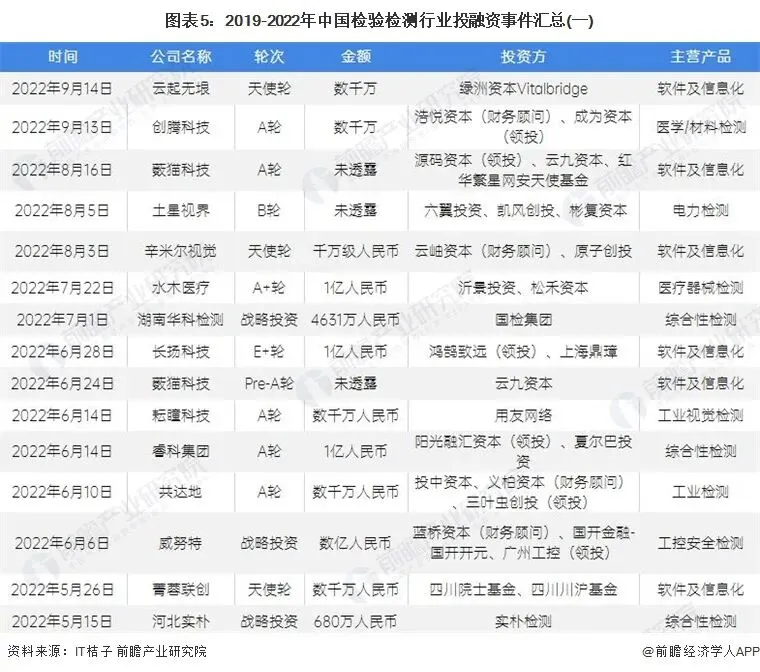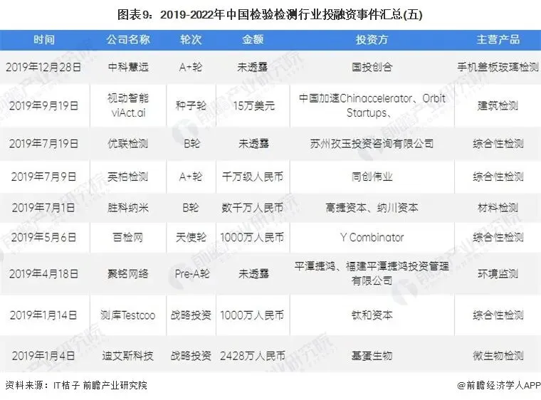 2019-2022年我国检验检测行业的主要投融资事件如下: