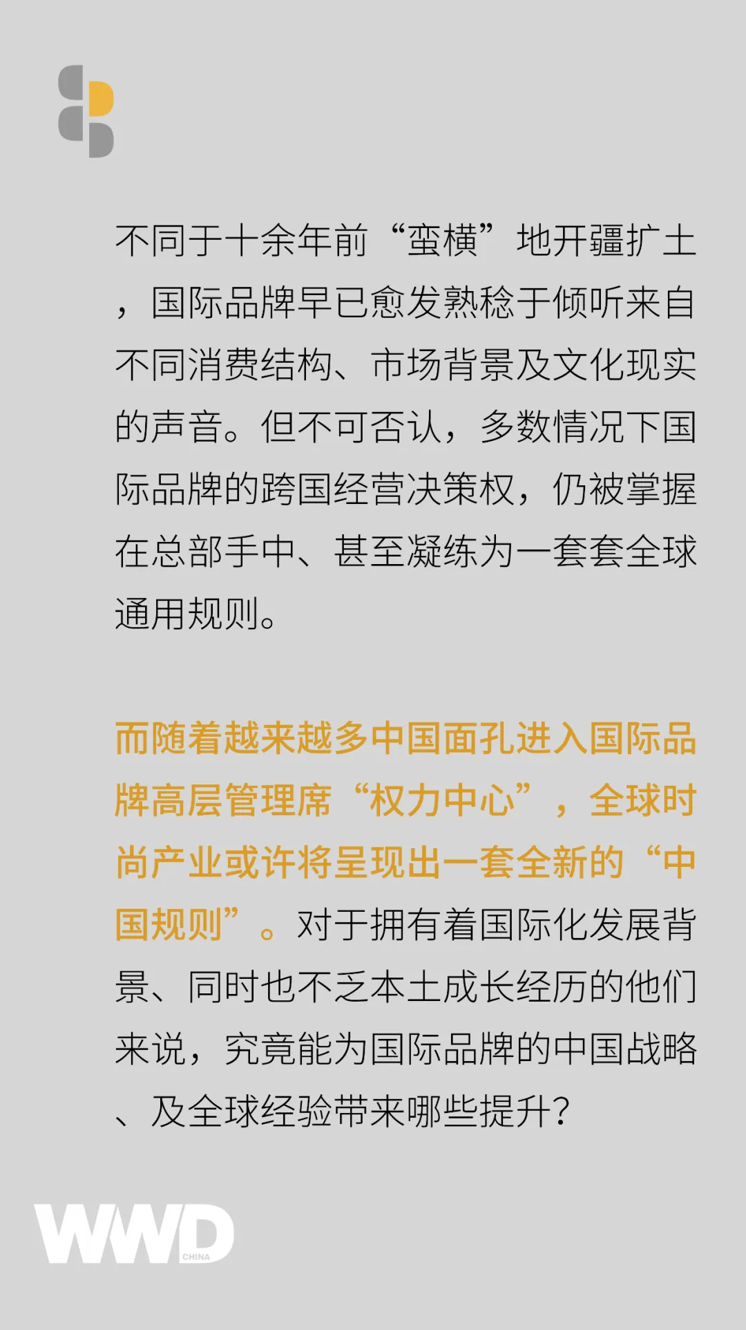 一方面,越来越多中国企业聘请和重用国际人才,以期融入世界,走向国际;另一方面,越来越多中国高管入局国际品牌的管理席,甚至成为参与全球业务决策的核心高管。未来,这套全新的规则体系不仅能赋予中国时尚商业文明自身更高质量的发展养分,这些养分也将在全球范围内发挥越来越显著的参考价值。WWD