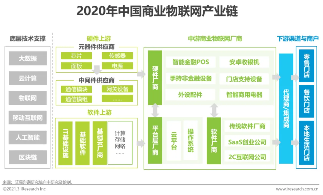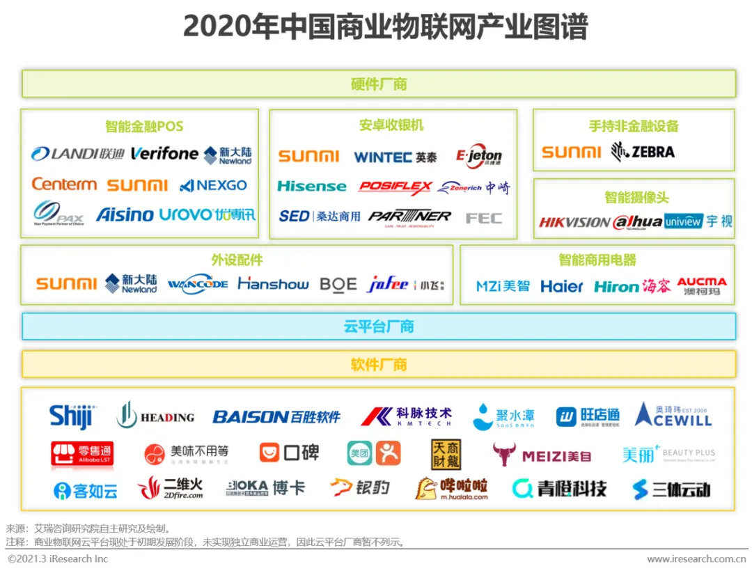 商业物联网产业链由上、中、下游三部分组成,其中下游主要集中在零售、餐饮和本地生活门店,位于中游的商业物联网服务商根据其所提供的核心业务可以被划分为硬件厂商、软件厂商和云平台厂商,对应不同的上游供应商。商业物联网服务商中既包含传统的软硬件提供商,也包括新兴的智能商用终端厂商、SaaS创业公司以及2C互联网公司。通过提供硬软件产品和云服务,商业物联网服务商可以帮助实体商业达到降本增效的目的,打通线上和线下环节获得差异化竞争优势。