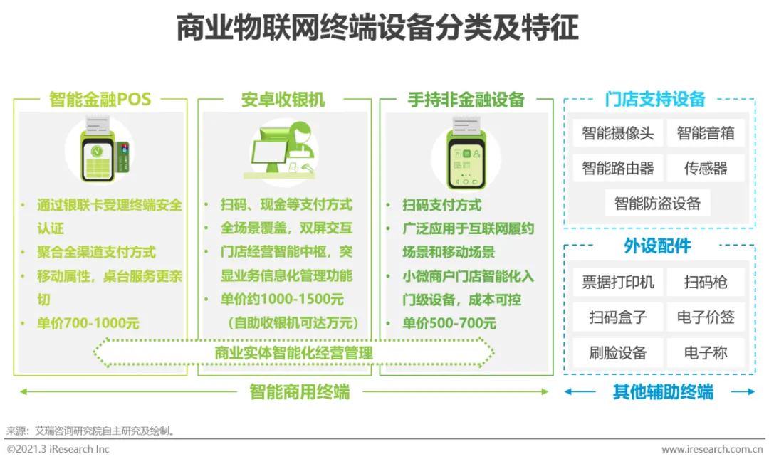 交易结算、订单履约环节是与消费者消费行为直接关联、生成数据资产的核心环节,因此搭载多垂直细分行业应用软件的智能交易、智能履约终端系商业物联网感知层的核心设备。区别于传统收银机,智能商用终端基于移动互联网与云平台技术,可运行各垂直细分场景应用软件,聚合收款等销售和管理相关功能,商户降本增效的同时提升消费者支付体验。其中,智能金融POS需经银联认证,具有市场准入壁垒;安卓收银机作为门店必备的交易场景设备更具稳定性,且单价较高;手持非金融设备单价最低,可满足外卖、排队点单等履约场景需求。