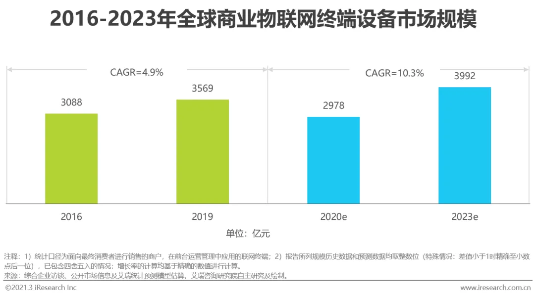 2019年中国商业物联网终端市场规模为1031亿元,自2016年以来的年复合增长率为5.2%。中国企业在硬件端的支出普遍高于软件,因而终端设备占全球市场的比例也高于商业物联网整体市场的17.7%,达到28.9%。疫情在对实体商户的正常经营造成冲击的同时,也促使数字化转型进程提速,Android系统终端愈发受到商户的青睐,将引领未来终端市场的增长,预计到2023年中国商业物联网终端市场规模将达到1244亿元。