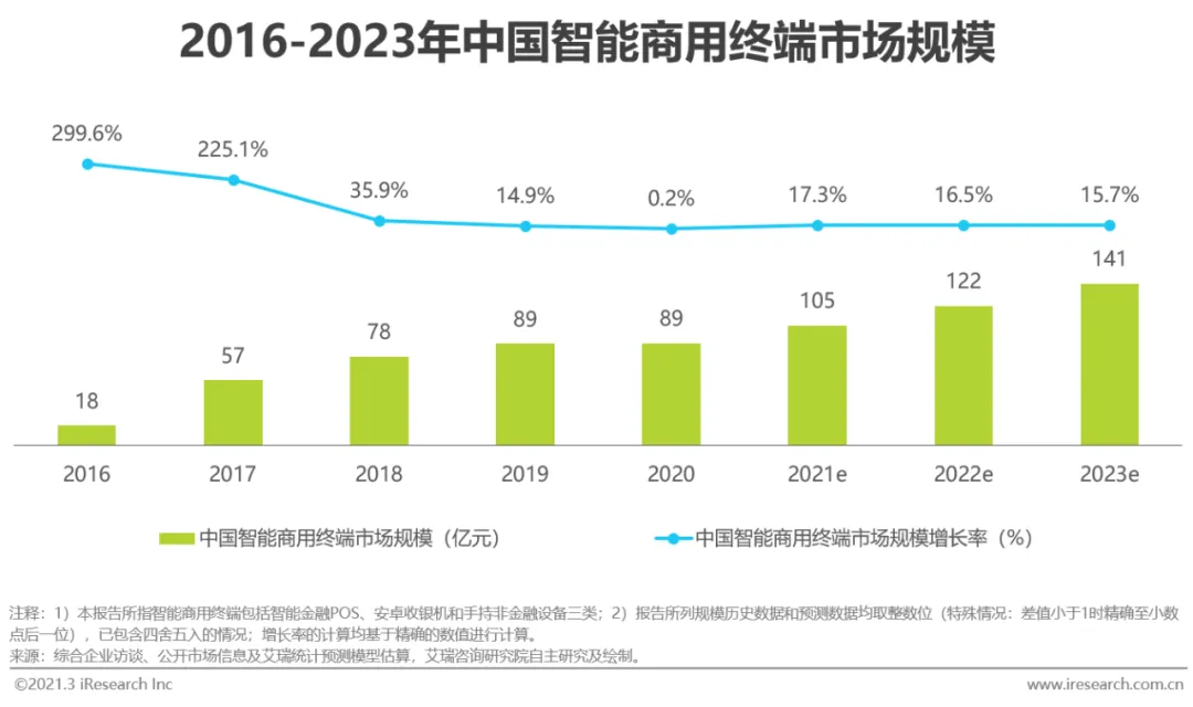 2020年中国智能商用终端市场规模为89亿元,在疫情影响下增长速度出现短暂回落,但预计自2021年后市场将会延续此前的快速增长,到2023年达到141亿元。