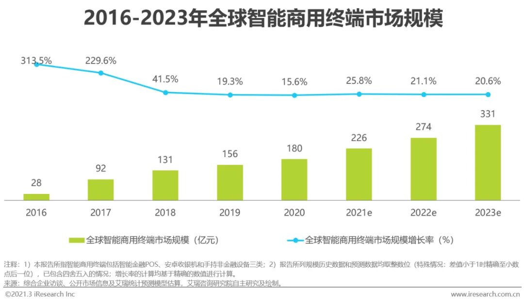 统计包括智能金融POS、安卓收银机和手持非金融设备在内的智能商用终端,2020年中国市场规模为89亿元,在疫情影响下增长速度出现短暂回落,但预计自2021年后市场将会延续此前的快速增长,到2023年达到141亿元。由于中国市场的智能商用终端起步较早,发展领先于海外市场,而海外市场需求受到疫情刺激,有望在2021年迎来新一轮爆发,加之中国厂商加速海外布局,预计未来全球智能商用终端市场增速将高于中国。