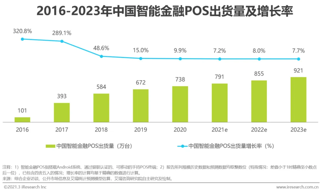 中国智能金融POS市场经过2015年以来的培育,已经处于相对成熟的阶段。2020年中国智能金融POS出货量达到738万台,出货量增速有所放缓,未来将逐步进入到以存量替换为主的时代。而海外市场移动支付发展落后于中国,智能金融POS渗透率较低,受到疫情催化,预计未来三年智能金融POS市场增速将高于中国,同时中国厂商也将加速迈向全球市场。